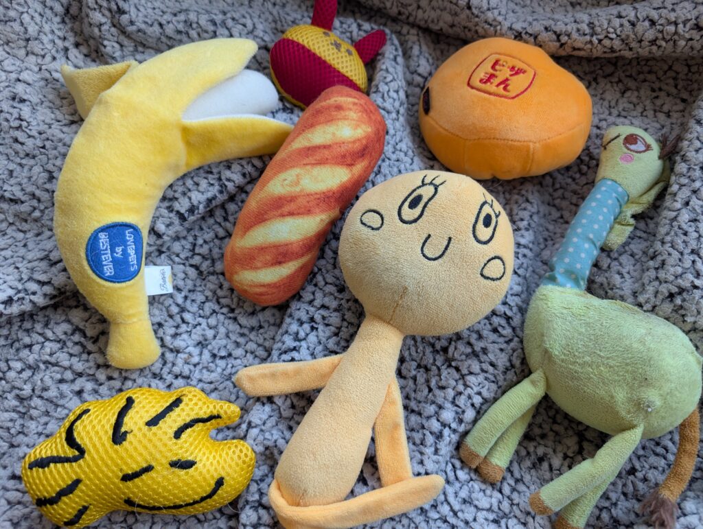 これまでに買ってきたおもちゃの数々。ピザまん、バナナ、うさぎにパン etc, etc。